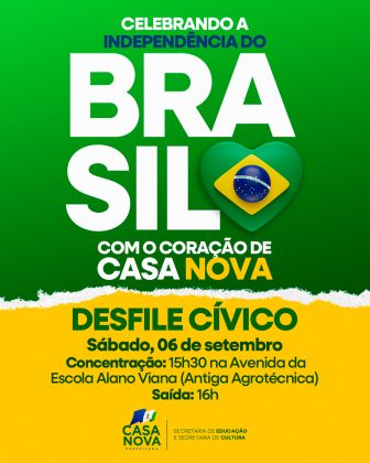 A Prefeitura de Casa Nova, por meio das Secretarias de Educação e Cultura, realizará neste sábado (06/09) o desfile cívico em comemoração à Independência do Brasil. Estudantes de 14 escolas das redes municipal, estadual e particular desfilarão pelas ruas da cidade.