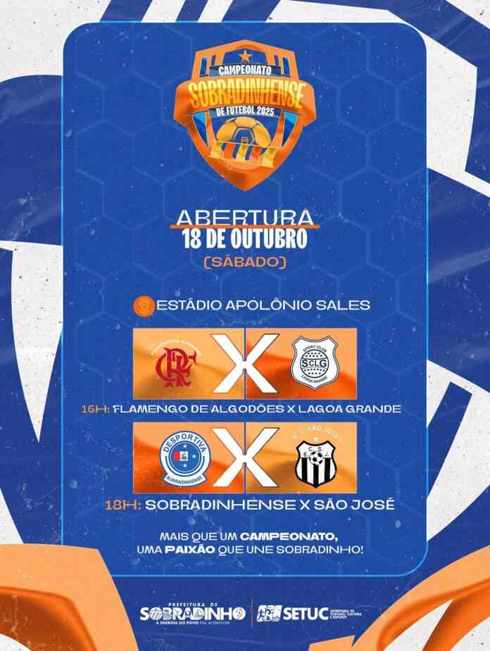 “Neste sábado, o Apolônio Sales será tomado pela energia do nosso povo e pela paixão pelo futebol. Convido todos os amantes do esporte a virem prestigiar os nossos atletas, apoiar suas equipes e vibrar juntos nessa grande festa. O Campeonato Municipal é mais do que uma disputa, é um encontro de talentos, amizades e emoções que só o futebol é capaz de proporcionar,” disse o secretário.