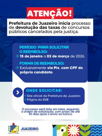 A Prefeitura de Juazeiro, em cumprimento ao acordo firmado com o Ministério Público do Estado da Bahia, MP-BA, com o Instituto de Desenvolvimento Institucional Brasileiro/IDIB e com o Serviço de Água e Saneamento Ambiental/SAAE, dará início, a partir desta quinta-feira (15/01), ao processo de devolução das taxas de inscrição referentes aos concursos públicos municipais regidos pelos editais nº 001/2024, 002/2024 e 003/2024, bem como ao concurso do SAAE, edital nº 001/2024, abertos pela gestão passada e cancelados por determinação da Justiça.